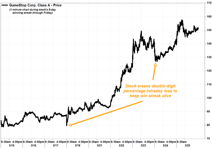 Durante l’attuale serie di guadagni, gli investitori di GameStop hanno mostrato una rara resilienza, cancellando due minimi intraday a due cifre per chiudere al rialzo. Il titolo è sceso del 10,0% il giorno successivo, il 18 marzo Risultati deludenti del quarto trimestre Prima di chiudere in rialzo del 3,5%, giovedì è sceso fino al 10,1% prima di chiudere in rialzo dell’1,0%.